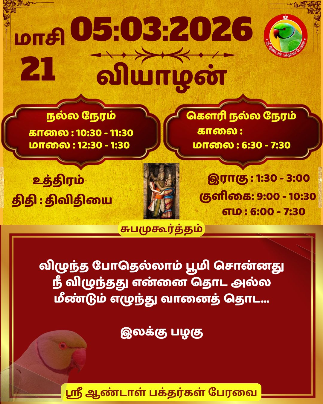 March 05 2026 0CommentSABP Posted by Vastu_Shastram In motivation SABPShare this: Tags: #daily_calender, APC, Calendar, calendar 2026, DAILY, DrAndalPChockalingam, Motivation, motivational quotes, motivational quotes daily, motivationalquotesoftheday, panjangam, SABP, SriAndalBakthargalPeravai, waytosuccess2026, ஆண்டாள், இன்றையநாள், காலண்டர், காலண்டர்2026, தன்னம்பிக்கை, தன்னம்பிக்கை2026, நாட்காட்டி, பஞ்சாங்கம், வாழ்கவளமுடன், ஸ்ரீஆண்டாள்பக்தர்கள்பேரவை Share: