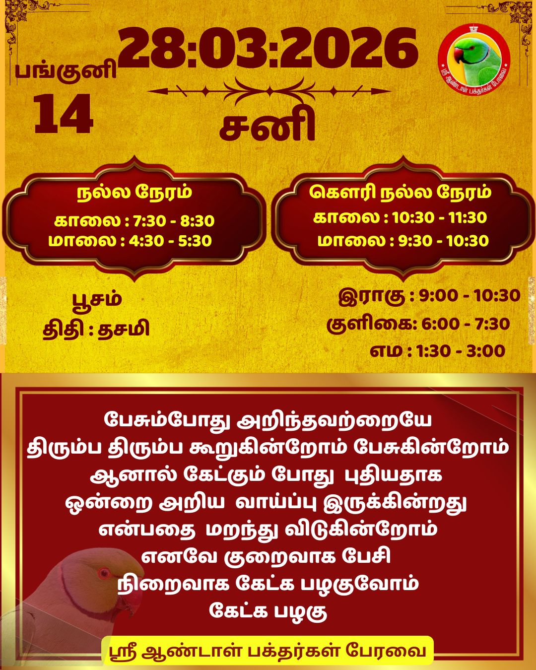 March 28 2026 0CommentSABP Posted by Vastu_Shastram In motivation SABPShare this: Tags: #daily_calender, APC, Calendar, calendar 2026, DAILY, DrAndalPChockalingam, Motivation, motivational quotes, motivational quotes daily, motivationalquotesoftheday, panjangam, SABP, SriAndalBakthargalPeravai, waytosuccess2026, ஆண்டாள், இன்றையநாள், காலண்டர், காலண்டர்2026, தன்னம்பிக்கை, தன்னம்பிக்கை2026, நாட்காட்டி, பஞ்சாங்கம், வாழ்கவளமுடன், ஸ்ரீஆண்டாள்பக்தர்கள்பேரவை Share: