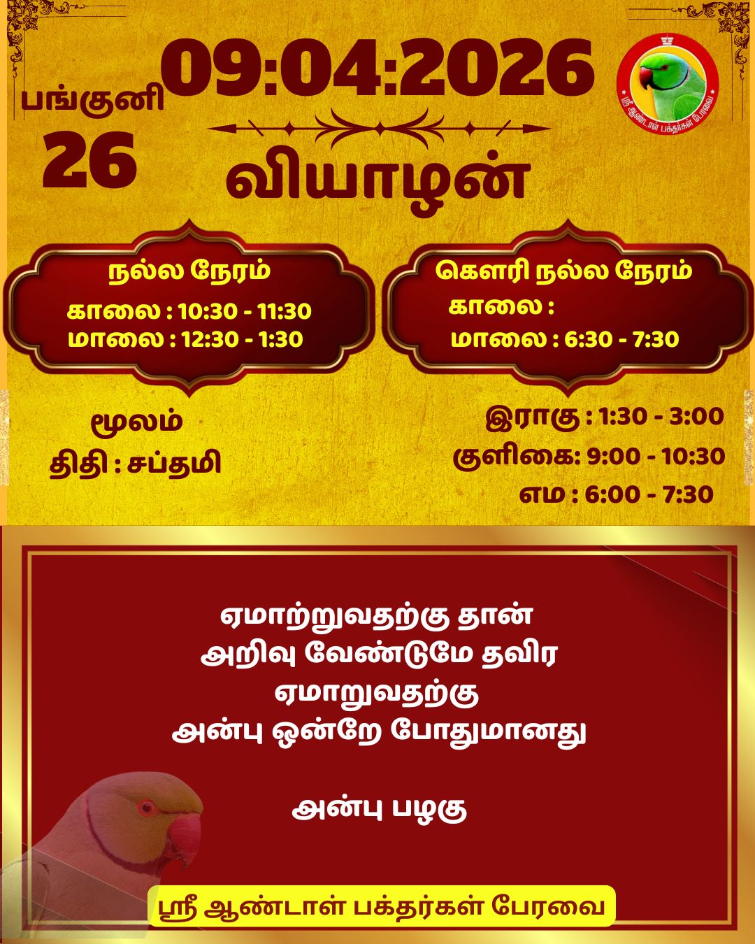 April 09 2026 0CommentSABP Posted by Vastu_Shastram In motivation SABPShare this: Tags: #daily_calender, APC, Calendar, calendar 2026, DAILY, DrAndalPChockalingam, Motivation, motivational quotes, motivational quotes daily, motivationalquotesoftheday, panjangam, SABP, SriAndalBakthargalPeravai, waytosuccess2026, ஆண்டாள், இன்றையநாள், காலண்டர், காலண்டர்2026, தன்னம்பிக்கை, தன்னம்பிக்கை2026, நாட்காட்டி, பஞ்சாங்கம், வாழ்கவளமுடன், ஸ்ரீஆண்டாள்பக்தர்கள்பேரவை Share: