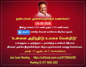 வரும் புதன்கிழமை (03.06.2020) மாலை 4:00 மணி முதல் 7:00 மணி வரை ஜூம் என்கிற செயலி (Zoom App) வாயிலாக வீடியோ மூலம் “கலங்கரை விளக்கம் – உன்னை அறிந்திடு உலகை வென்றிடு” – உங்களுடைய அடுத்தகட்ட நகர்விற்கு ஆன்மீகம் மற்றும் உளவியல் ரீதியான தீர்வுகள் அளிக்க இருக்கின்றேன் விருப்பமுள்ளவர்கள் கலந்து கொள்ளவும்.